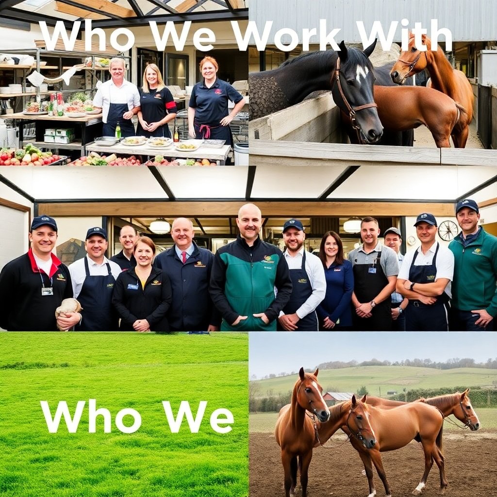 Montage of catering staff, farmers, equestrian professionals